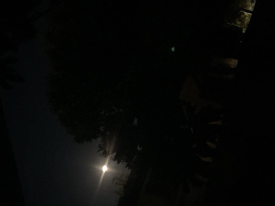 The image displays an outdoor night scene in Sarouja Municipality, Syria. A bright, circular light source, identified as the moon, is positioned in the upper-left portion of the frame, casting significant glare and horizontal light streaks. Dark, dense foliage from trees or large bushes occupies the central and right areas of the image, silhouetted against the ambient light on the left and appearing as an undifferentiated mass on the right. The foreground and lower-right quadrant are profoundly dark, rendering specific objects or ground features indistinct. No people or specific man-made structures are discernible. A small, faint greenish-blue light anomaly is present in the lower-right quadrant, likely a lens flare.