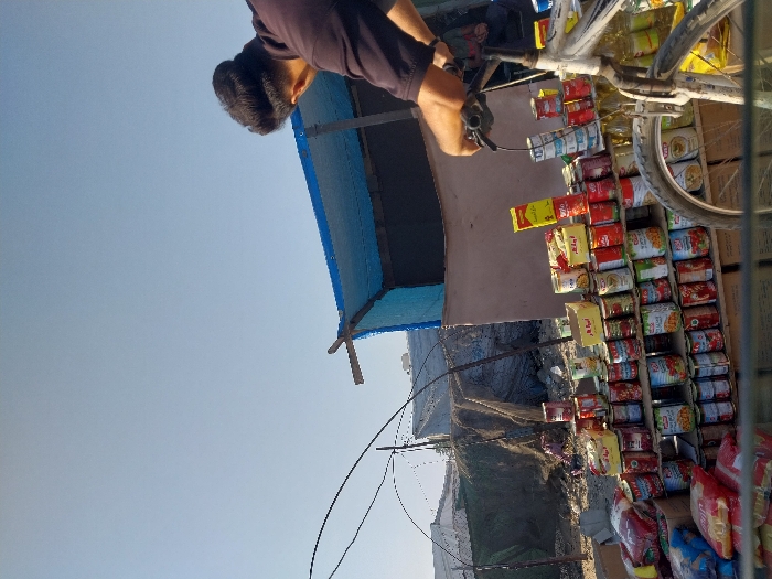 The image captures an outdoor scene in Deir el-Balah, Palestinian Territory, under a clear blue sky. In the foreground, on the right, the back and right shoulder of a person wearing a dark short-sleeved shirt are visible. The person's right hand is positioned on the handlebar of a white bicycle, which occupies the lower right portion of the frame, showing its front wheel and handlebars. The central element is a multi-tiered market stall constructed from wooden planks. This stall is densely packed with numerous canned goods, many displaying Arabic labeling. These cans appear to contain food products, including items resembling tomato paste. Several yellow boxes are distributed among the stacked cans. To the left of the canned goods, multiple large bags, colored red, blue, and white, are stacked on the ground or a low platform, likely containing dry provisions. In the mid-background, directly behind the market stall, a rudimentary structure with a blue tarp roof supported by wooden elements is visible. Further to the left background, an area of exposed dirt ground leads to additional makeshift structures, characterized by dark tarps and netting draped over arched frames, possibly fashioned from metal or PVC pipes. The overall environment is open-air, with discernible bare earth and a bright, unobstructed blue sky.