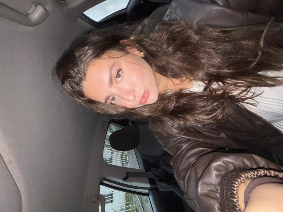 A young adult female with long, wavy dark brown hair, fair skin, and light brown eyes is depicted in a selfie taken from inside a vehicle