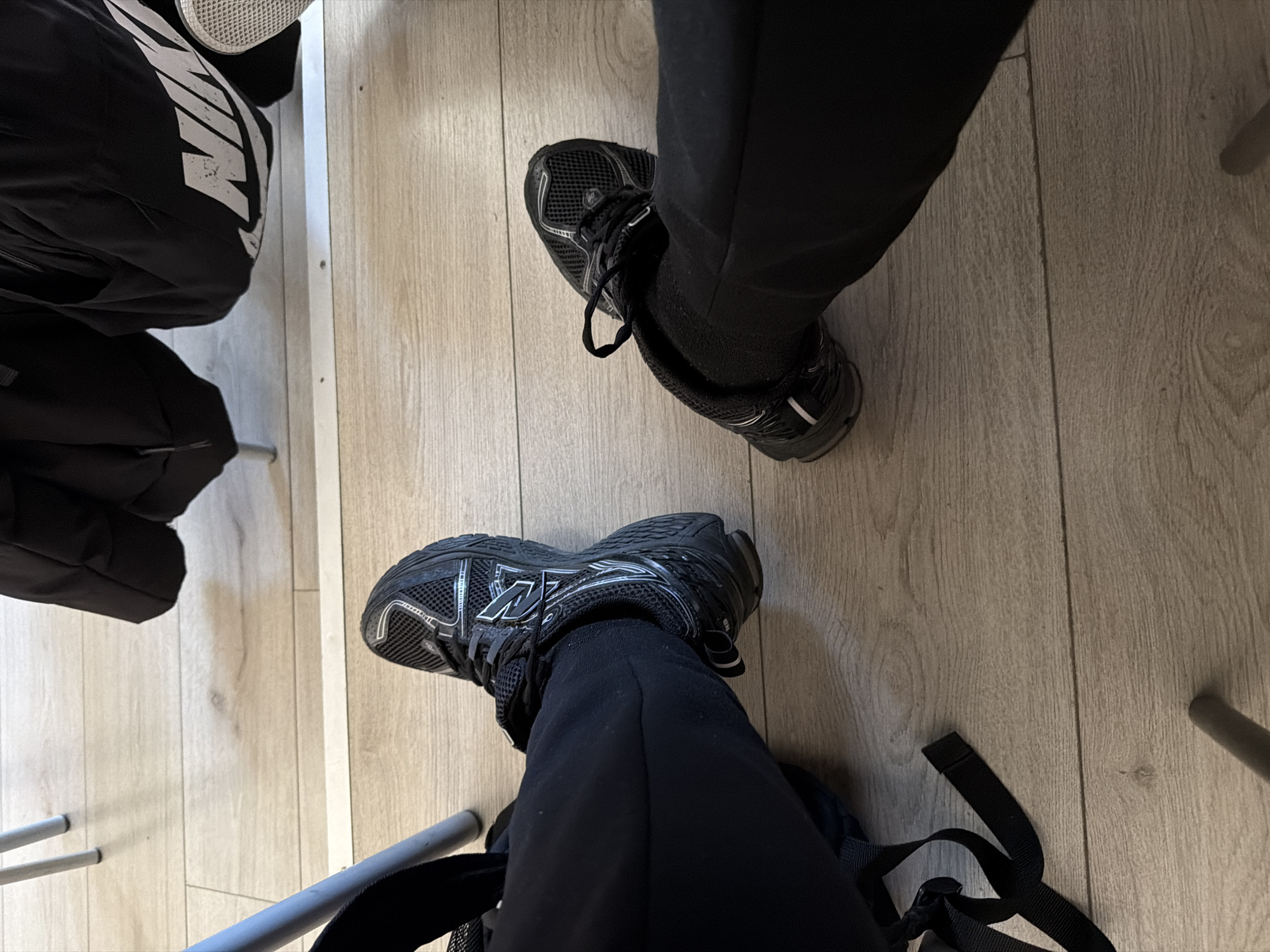 two pairs of legs, one in the upper right wearing black running shoes and black pants. The other is in the lower left wearing black New Balance running shoes and black pants. The setting is an indoor space with a light-colored wood-like floor. The presence of a backpack suggests the legs belong to people in a public place. There is no evidence to show the location is in Panagyurishte, Bulgaria.