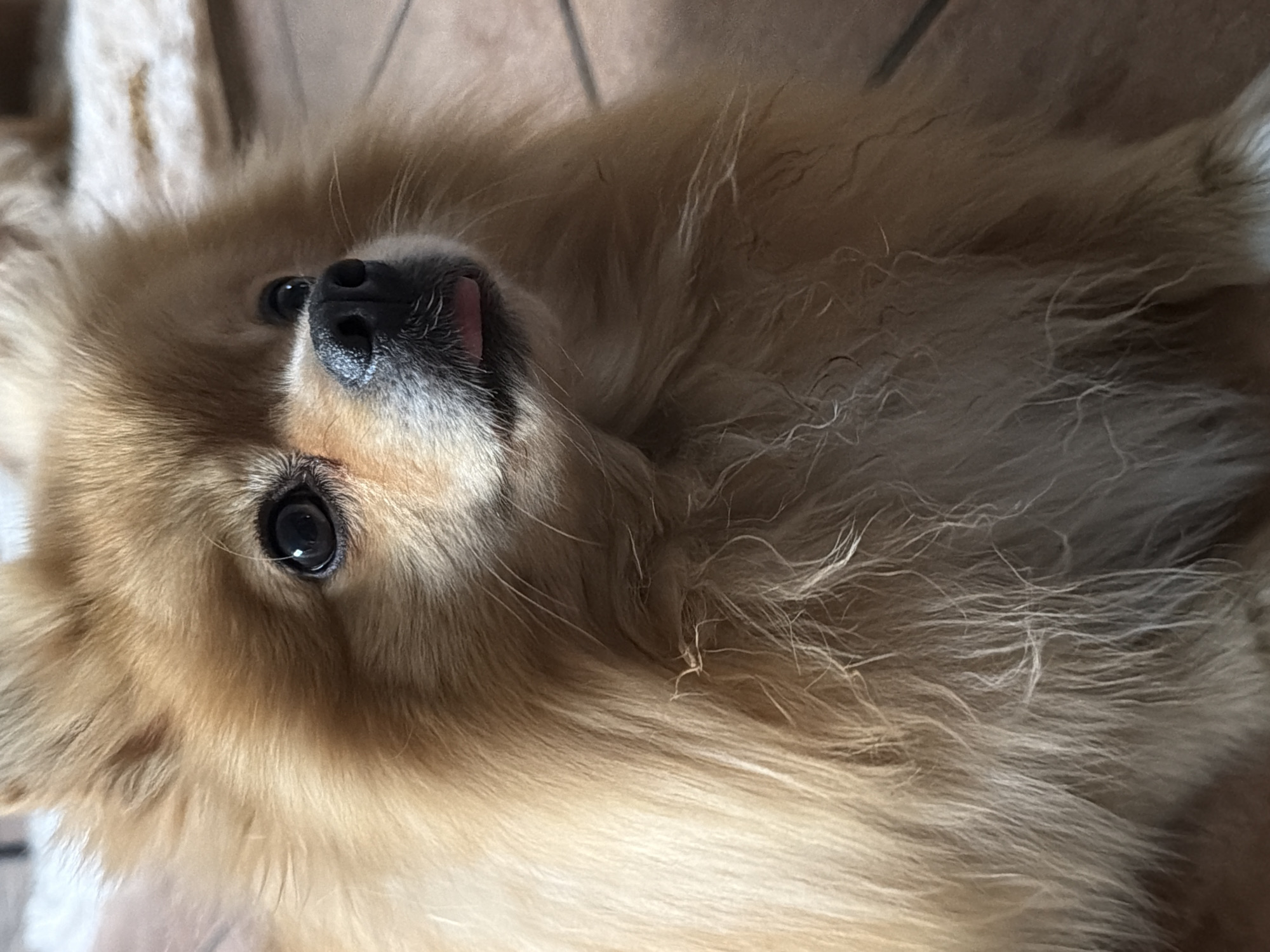 A close-up shot of a light-brown, fluffy dog with black eyes and a black nose. The dog is lying on its back, with its tongue slightly protruding. The background is blurry, but appears to be a tiled floor. There is no indication of the location being in the city of Cuautla, Mexico.