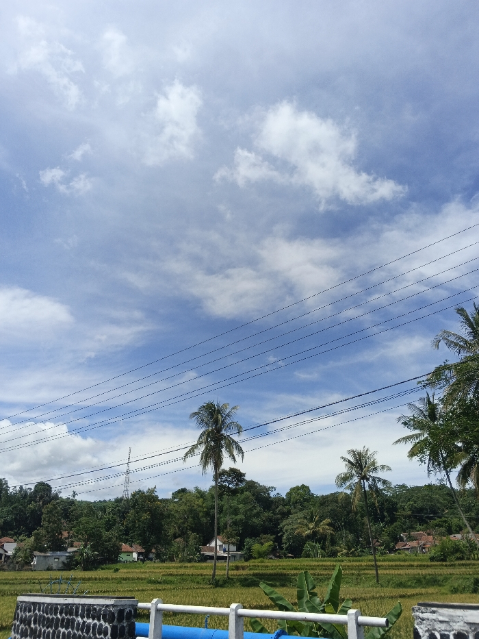 A vibrant landscape under a partly cloudy blue sky is captured. Power lines stretch across the upper portion of the frame. Below, green trees and palm trees dot the horizon, interspersed with rooftops of houses. A golden rice field is in the midground. The foreground features a barrier with a blue pipe. The composition creates a sense of depth, highlighting the rural scene.