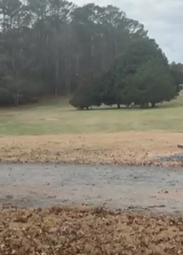 disc golf player throwing a disc toward a basket in a grassy field. The thrower is not visible in the frame, only the disc is visible in flight. The field is bordered by trees in the background. The foreground consists of a gravel path and leaves covering the ground. The sky is overcast. People can be heard shouting in the background.