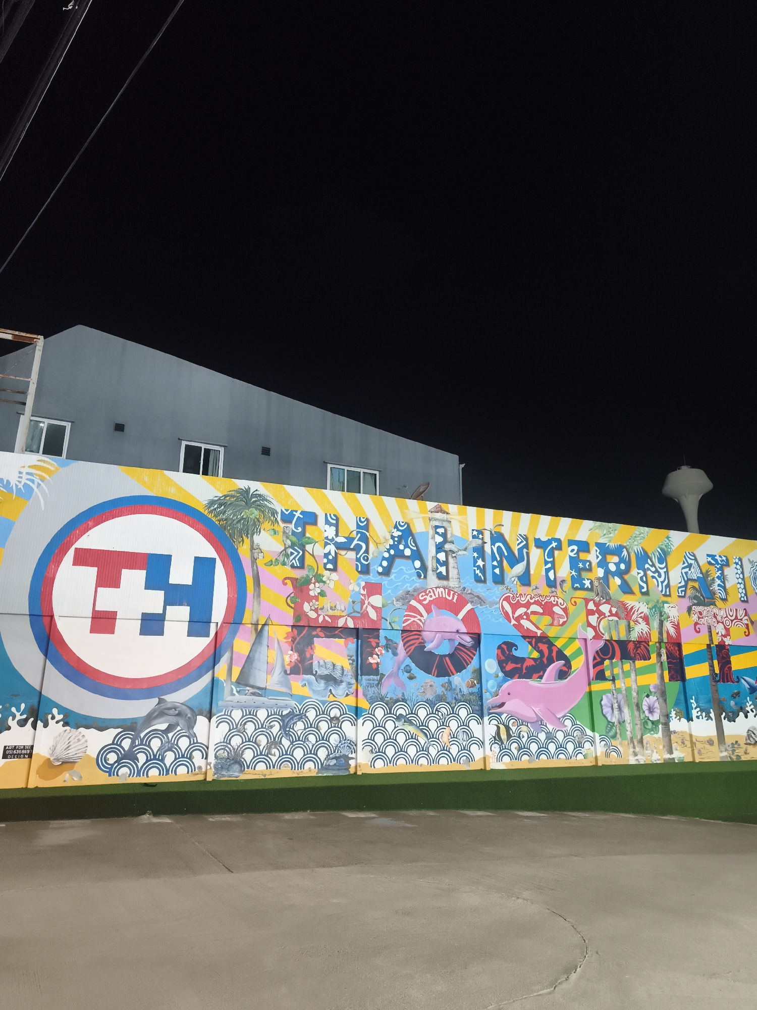 The image depicts a colorful mural on a long wall in Baan Bo Phut, Thailand