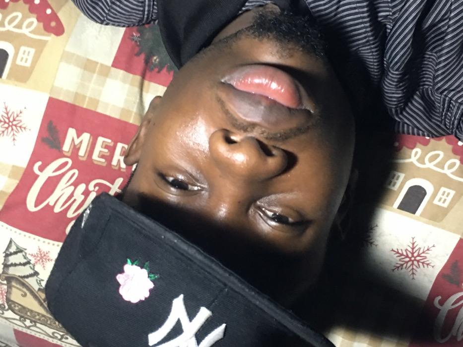 A person lies on a Christmas-themed blanket wearing a pinstripe shirt and a black baseball cap. The cap features a white "NY" logo and a pink flower. The individual has dark skin, a close-cut beard, and glossy lips. The blanket showcases a "Merry Christmas" message, gingerbread houses, and snowflakes. The image is rotated, placing the subject's head at the bottom of the frame.