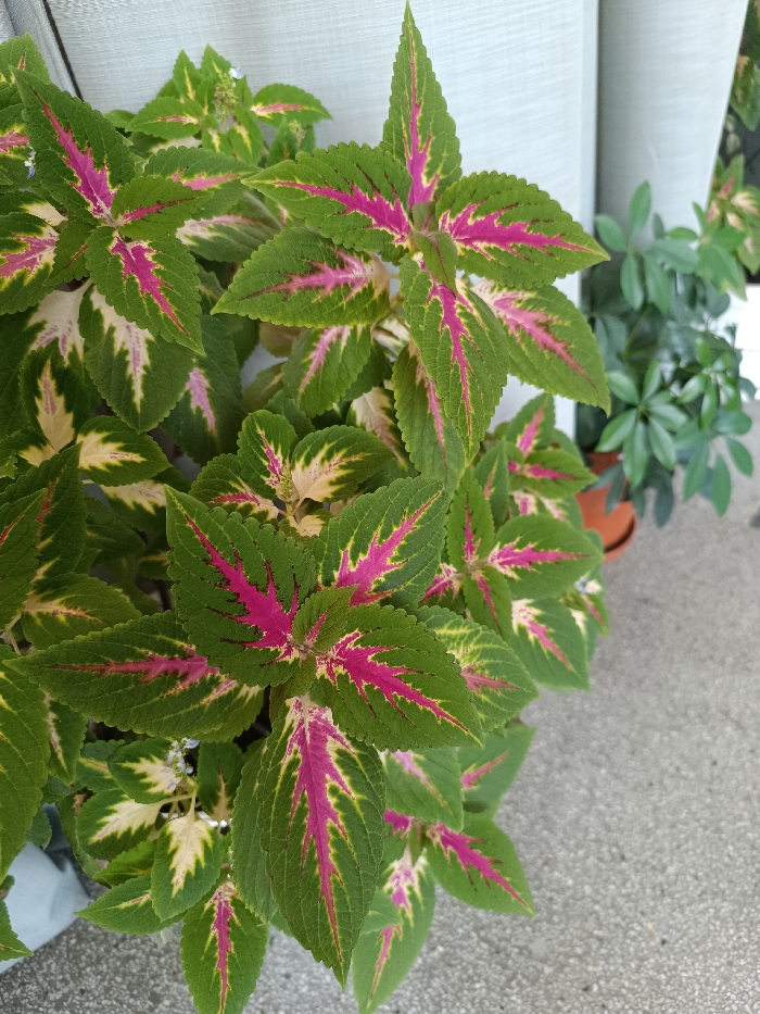 - "The scene depicts a potted plant featuring large, ovate leaves with serrated margins, characterized by a variegated pattern of bright green edges, a prominent fuchsia or deep pink central streak along the main veins, and bordering pale yellow or cream accents" by FM-SVEiv2, licensed under CC BY 4.0