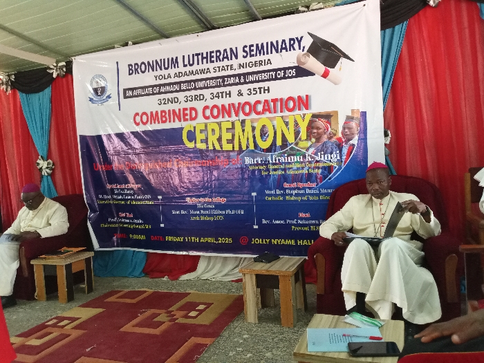 Two men in clerical robes are seated in maroon chairs in a hall in the Jolly Nyame Hall of the Bronnum Lutheran Seminary in Yola, Adamawa State, Nigeria. The men are facing forward. The man on the left is looking down and holding a book. The man on the right is looking towards the camera and holding a piece of paper. A banner behind them indicates that this is the 32nd, 33rd, 34th, and 35th combined convocation ceremony. The banner also mentions the guest speaker is Barr. Afraimu K. Jingi. The ceremony was held on Friday, April 11, 2023. A red rug is on the floor in front of the men. Several small tables with a few objects are in the foreground. The hall is decorated with red and blue cloth. The walls have white and red patterned fabric. A smaller banner at the bottom of the banner mentions that the event started at 9:00 AM. The location, based on the coordinates (latitude: 9.185, longitude: 12.522), is within the city of Yola, Adamawa State, Nigeria.