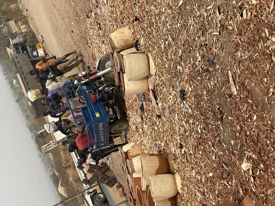 This image depicts an outdoor scene in Zongon Daji, Nigeria, characterized by significant woodworking activity