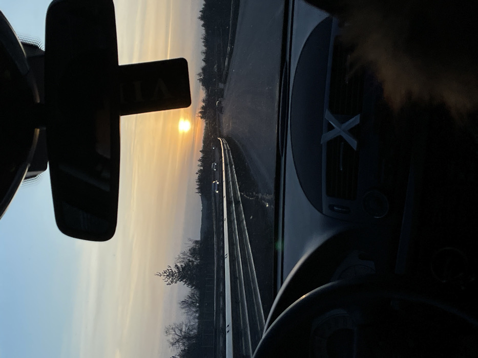 The scene depicts a road view at sunset or sunrise, observed from the interior of a vehicle in Krushovitsa, Bulgaria. The sky transitions from light blue overhead to hues of orange and yellow at the horizon, where a bright, circular sun is centrally positioned slightly right. The road, appearing to be a highway, extends forward, with a multi-tiered metal guardrail or median barrier running along the left side. Trees, some bare and others evergreen, line the roadside and are visible in the distant background, indicating a natural or semi-natural environment. Several vehicles are observed on the road ahead; two with visible headlights appear in the left lane or a parallel road section, and another vehicle is further down the right lane. The foreground reveals the dark silhouette of the interior of the vehicle from which the image was captured, including a partial view of a steering wheel on the left and the top of a dashboard. A rearview mirror is centrally positioned, obscuring part of the sky and horizon. An air freshener or similar dark, rectangular object with partial text (possibly "VLTIA") hangs from the rearview mirror. A light-colored "X" shape is taped over one of the central air vents on the dashboard. No individuals are explicitly visible, but the perspective implies an occupant within the vehicle.