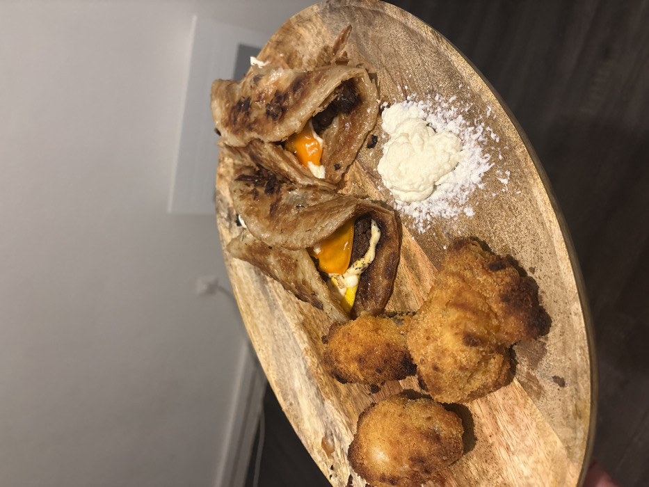 A wooden platter presents three filled wraps with visible egg yolks and a dark protein, next to a dollop of white spread, lightly dusted with powder. The platter also holds a few golden-brown, crispy-looking, bite-sized food pieces. The wraps appear to be layered and slightly charred. The overall arrangement of the food is casual and appetizing.