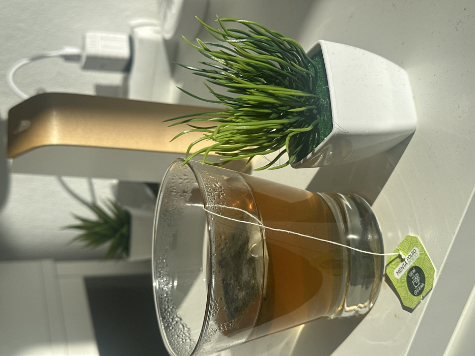 This image depicts an indoor tabletop scene in Madrid, Spain, illuminated by strong natural light casting distinct shadows. In the foreground, a clear glass contains an amber-colored liquid with a submerged tea bag. Condensation droplets adhere to the exterior of the glass. A white string connects the tea bag to an octagon-shaped, green and white label resting on the light-colored surface. The label prominently displays "MENTA POLEO" along with brewing instructions (150 ml, 5-6 min). To the immediate right of the glass, a small white square pot holds artificial green, spiky grass. In the blurred background, from left to right, an out-of-focus artificial plant in a white pot, a vertical gold-colored curved object, and a white wall charger with an attached white cable are visible against a white wall. The objects rest on a flat, light-colored surface.