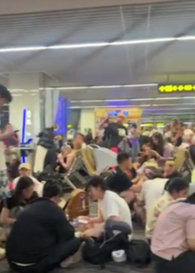 crowded airport terminal, with a large group of people sitting on the floor and others standing around. Many people have luggage with them, including suitcases and backpacks. Some people are eating, while others appear to be waiting. There are airport signs visible in the background. The terminal appears to be well-lit, with a mix of natural and artificial light.