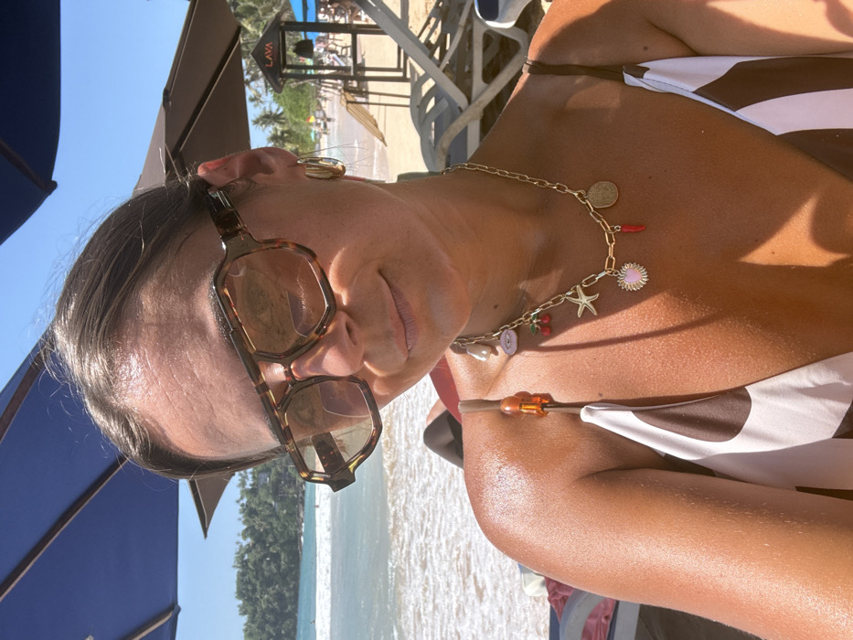 A woman in sunglasses and a brown and white swimsuit poses near the ocean. She wears a gold chain necklace adorned with a starfish, coral, a pink flower, and other charms. Part of a beach umbrella is visible in the corner, and the shoreline with other beachgoers extends into the distance. The picture is taken in bright sunlight.