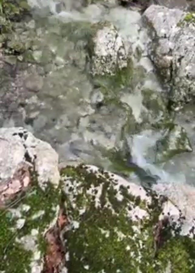 A small, clear stream flows over moss-covered rocks. The water is shallow and the rocks are visible through it. The sound of the water is audible. The stream appears to be in a natural setting, likely a forest or woodland area.