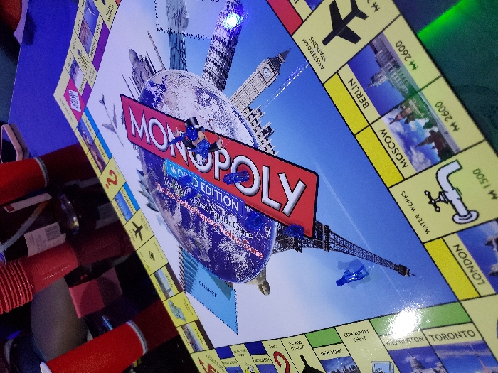 A "Monopoly World Edition" board game is displayed