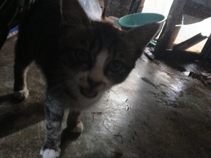 The image, set in Bien Hoa, Vietnam, displays a domestic cat, appearing to be a tabby with prominent white markings on its muzzle, chin, and paws, particularly the front left paw. The cat is standing on a concrete floor, its head central and oriented towards the viewer. Its dark eyes are fixed on the camera, and its mouth is slightly open, revealing a pink tongue. In the dimly lit background, a light green plastic bowl is positioned to the right, partially obscured behind the cat's head. Dark, indistinct structural elements, consistent with wooden beams or supports, are visible in the upper right background. The concrete floor exhibits unevenness and patches of moisture or wetness, particularly in the mid-right section. Minor debris or refuse is present on the floor in the far background. The scene suggests an indoor or sheltered outdoor environment. No human subjects are visible.