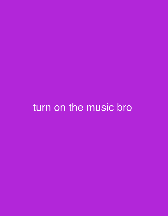 The image features a solid purple background. White text is centered on the bottom half of the image. The text reads "turn on the music bro" in lowercase. The overall design is simple and direct.