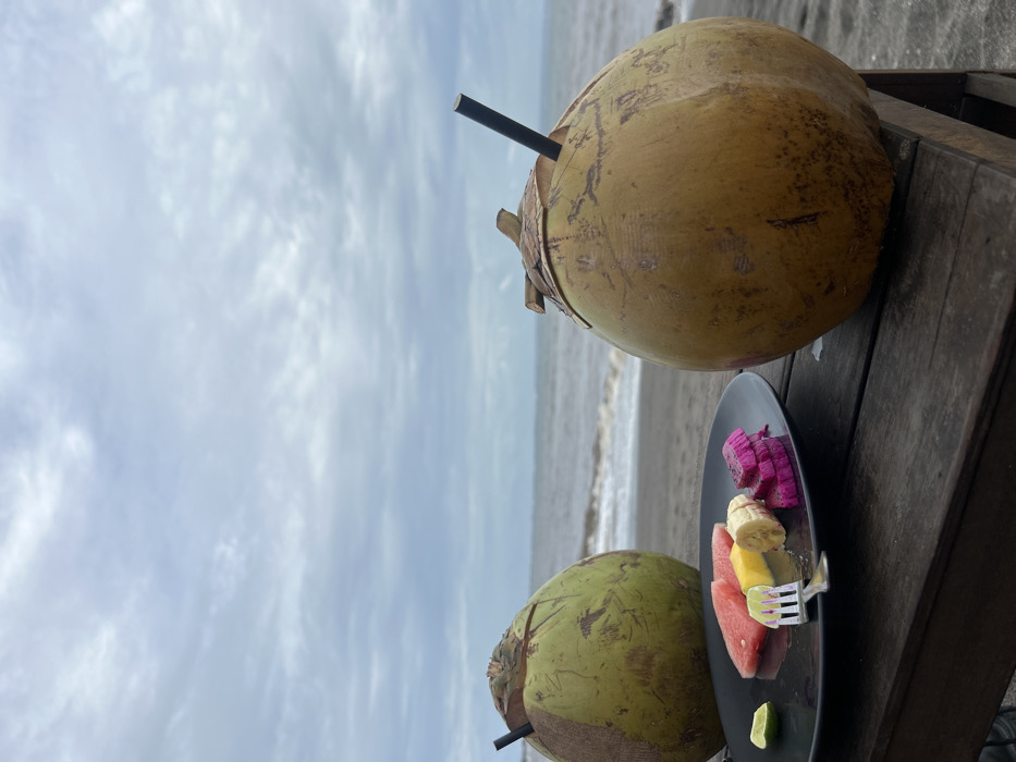 Two whole coconuts, prepared for drinking, and a plate of sliced fruit rest on a dark wooden surface