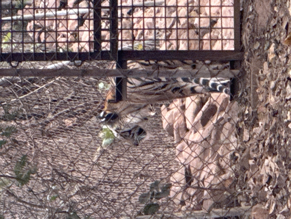 An image captured in Bhopal, India, depicts a Bengal tiger (Panthera tigris tigris) within an enclosure at what appears to be a zoo or wildlife rescue center, likely Van Vihar National Park