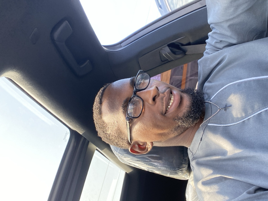 The image displays an adult male seated in the driver's position within a vehicle in Igboefon, Nigeria, under bright daylight. The subject possesses dark skin, short dark hair, a beard, and wears black-framed eyeglasses. He is attired in a grey garment with white piping accents and a silver-colored chain bearing a cross pendant around his neck. His expression is a slight smile directed towards the camera, revealing teeth. The vehicle's interior features a dark headliner, a visible sunroof, and a passenger headrest covered in clear plastic sheeting. Bright sun glare is evident through the sunroof and the passenger-side window, where a blurred background suggests an outdoor architectural element with horizontal lines.