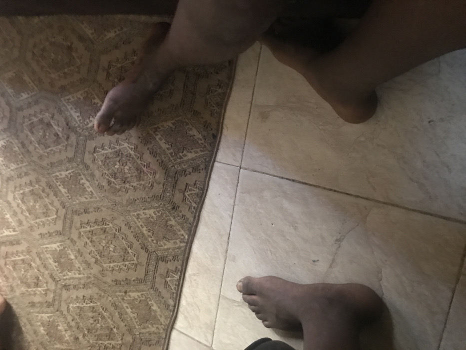 An indoor scene in the city of Unknown, Unknown, captured from a high angle, displays a floor surface divided between light-toned square tiles in the foreground and a patterned rug in the background. The rug features a repeating geometric design with hexagonal and diamond motifs in shades of beige and brown. Multiple bare feet and lower leg segments, belonging to individuals with dark skin tones, are visible. A bare left foot is positioned flat on the tiled floor in the lower-left quadrant. In the upper-right quadrant, a bare right foot and partial lower leg are visible, resting partially on the rug with the foot angled. Another partially visible bare foot is present on the tiled floor in the lower-right quadrant. The feet suggest individuals are in a seated or resting posture within an indoor environment with ambient lighting.