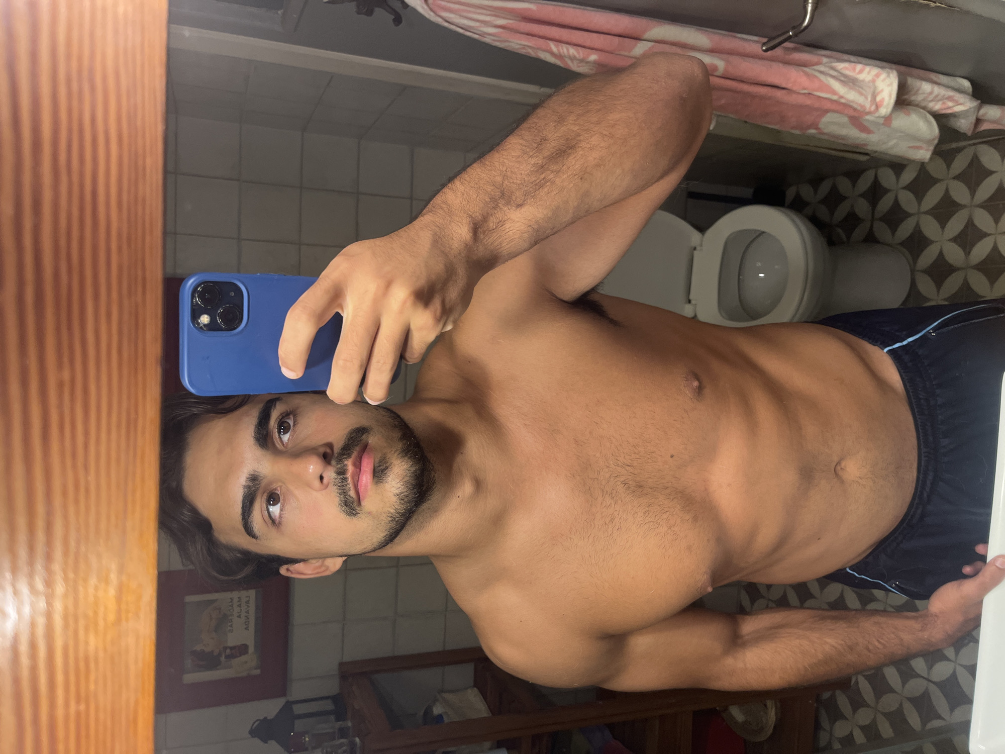 A man is taking a selfie in a bathroom. He is shirtless and wearing dark shorts. He is holding a blue smartphone in his left hand. The bathroom features tiled walls, a toilet, a towel hanging from a rack, and a cabinet beneath the mirror. A picture frame can be seen to the left of the man. The location in the city of Avellaneda, Argentina is not discernible from the image.