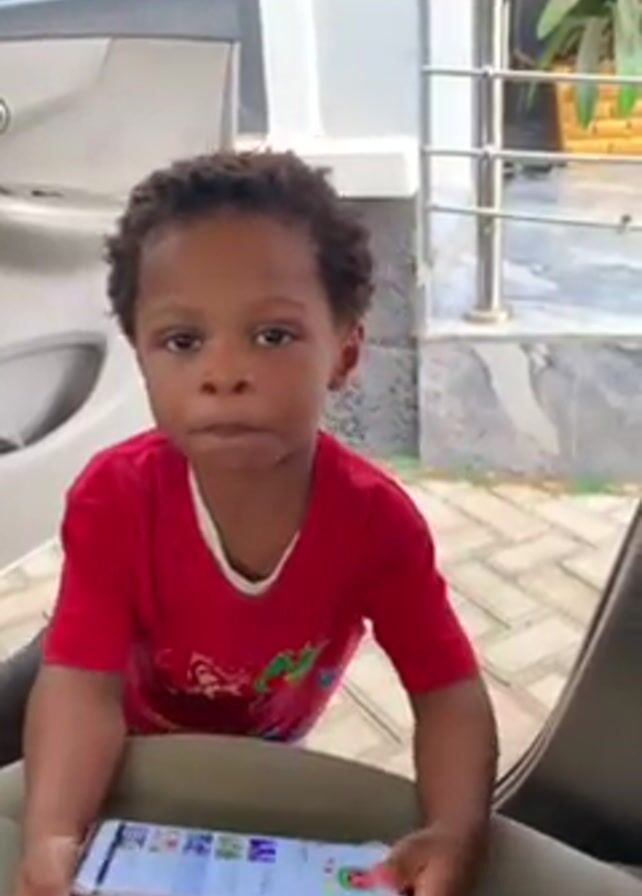 A toddler-sized, black child is sitting on the tan, upholstered seat of a car and holding a cell phone. The car door is open behind the child. The child is wearing a red t-shirt and black pants. The phone screen shows a children's show or video. A silver and white metal railing is behind the car. Outside the car, the ground is paved with light grey bricks in a herringbone pattern. There is a potted plant in the background, just right of the railing. The child looks toward the camera and touches the screen of the phone. Someone off camera says "Baba." The child says "Baba". The child then looks back at the screen on the phone. A phone rings.