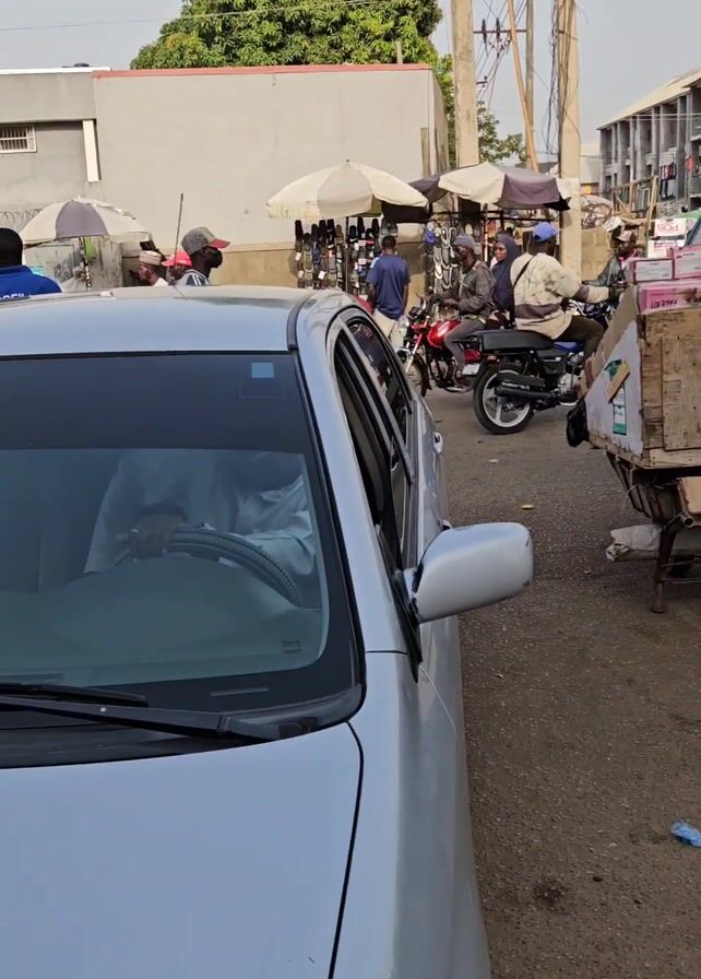 The video depicts a street scene in what appears to be a bustling market area. A silver sedan is parked on the side of the road, with the camera positioned from the driver's perspective. People dressed in various attire, including traditional outfits, are milling about. Some are standing near the car, while others are walking past. Motorbikes are also present, with riders maneuvering through the crowd. A cart loaded with goods is visible, suggesting that this is a place where commerce is taking place. The background shows buildings and other infrastructure, indicating an urban setting. The overall impression is one of a busy, active marketplace with a diverse range of people and activities.