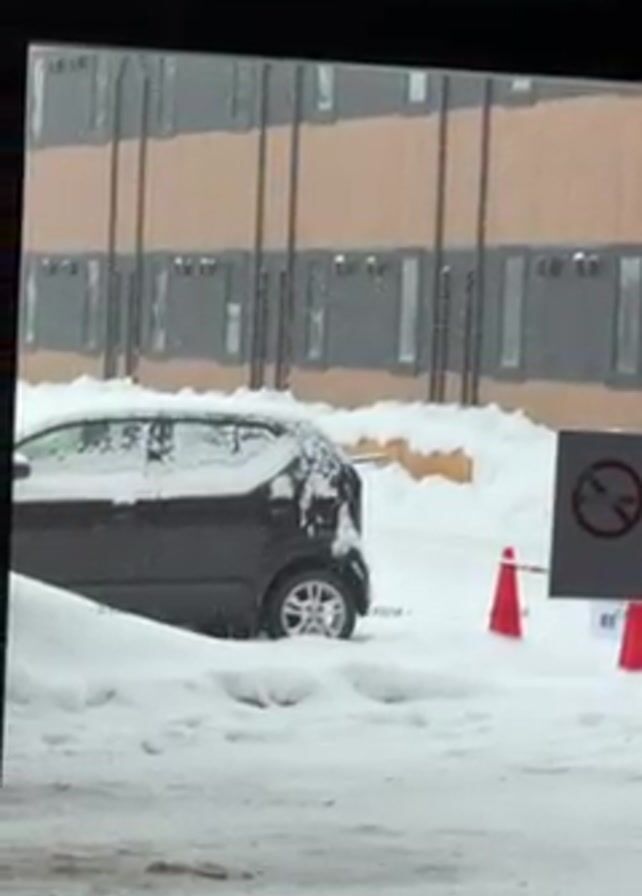 snowy scene viewed through a window. A black car is parked in the snow, with a layer of snow covering its roof and parts of its body. Behind the car, there's a building with multiple windows. Orange traffic cones and a sign with a crossed-out cigarette are visible next to the car. Snow is falling.