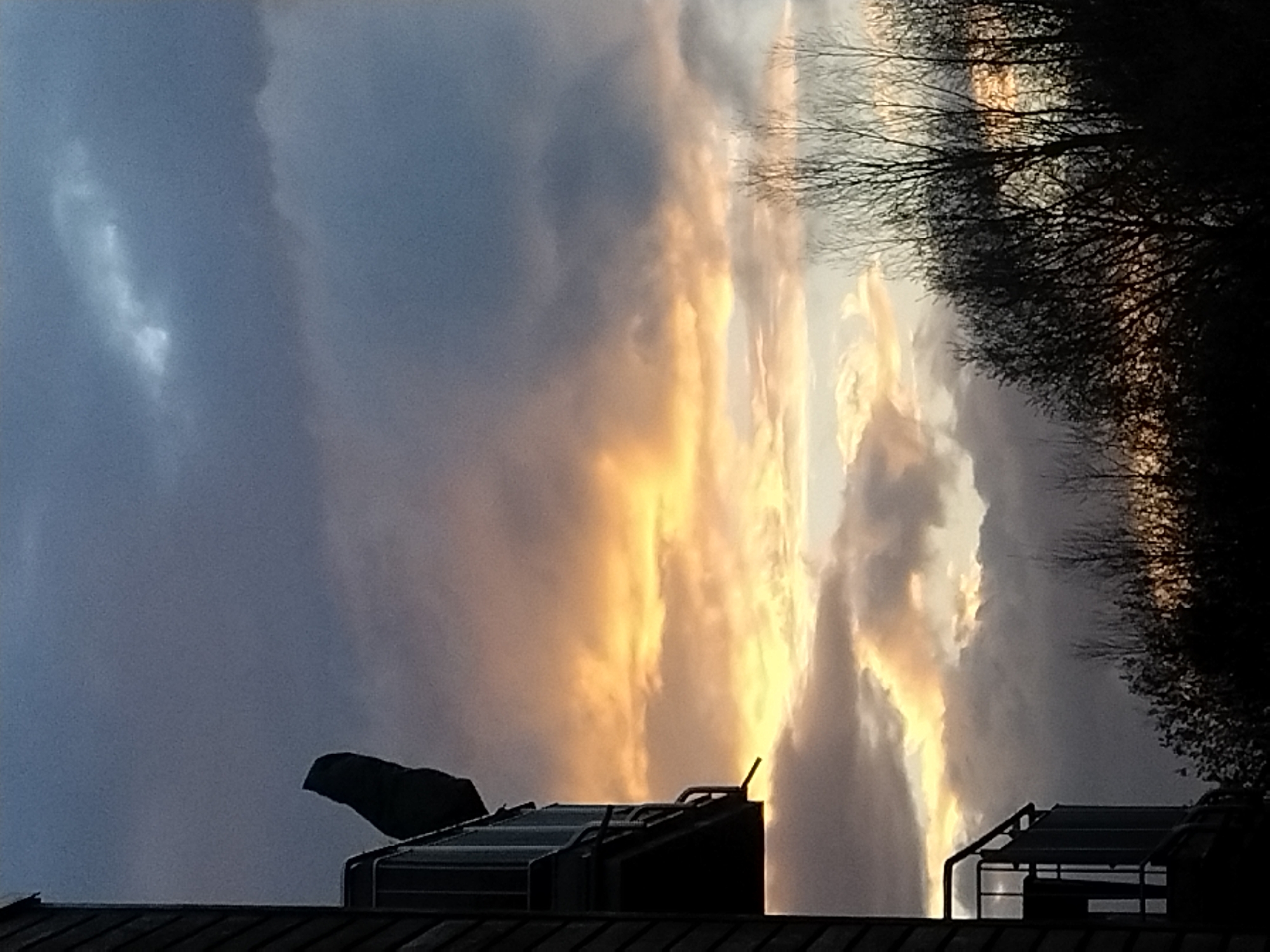 The image depicts a sky at dusk or dawn, with orange and yellow clouds transitioning to a dark blue sky. In the foreground, a rooftop is visible with mechanical equipment, possibly HVAC units. A dark shape resembling a bird or a similar object is perched on one of the units. The silhouette of trees is present in the upper right of the image. There is no indication this photo was taken in Crauthem, Luxembourg.