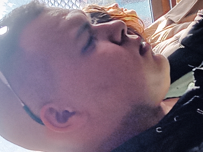 The image depicts two individuals within an interior setting, likely a vehicle, in Kotel, Bulgaria. In the foreground, a male subject is shown in profile, facing right. He possesses a light skin tone, a shaved head or very short dark hair, and wears sunglasses perched on his head. His eyes are closed or cast downwards, and his mouth is slightly ajar. He is dressed in a dark hooded garment, possibly a hoodie, layered over a lighter-colored shirt. Behind and to the right of the male, a female subject is partially visible, also in profile and facing right. She has reddish-brown hair, illuminated by strong sunlight entering from the right, and is wearing a light-colored, possibly beige or light brown, puffy jacket. A window or transparent barrier with a grid-like pattern is visible behind the female, showing an indistinct outdoor background. No discernible interactions between the subjects are depicted; both appear to be passive or resting.