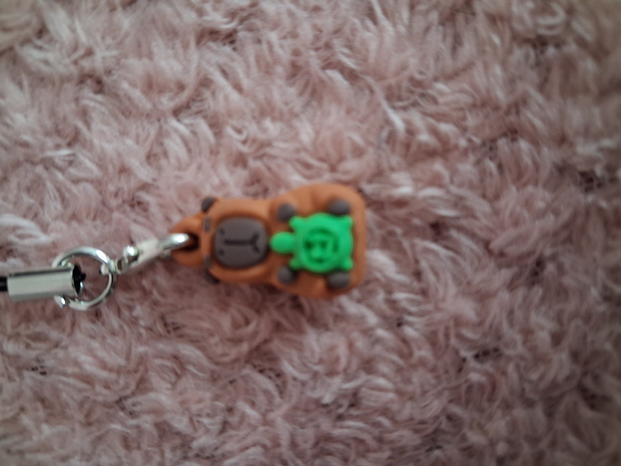 A small, out-of-focus object, identified as a keychain or charm, is depicted resting upon a textured, light pink, shaggy, or fuzzy surface. The charm is composed of a dark gray/black strap connected to a silver-colored metallic clasp and ring assembly. Attached to this assembly is a stylized figure, predominantly orange-brown, approximately rectangular with rounded edges. This figure features a dark gray facial area resembling a 'T' shape and four small, dark gray limb-like protrusions. Centered on the orange-brown figure's body is a distinct, bright green, stylized representation of a turtle. The background surface exhibits consistent light pink coloration and a soft, uneven texture characteristic of plush fabric or synthetic fur. No human figures are present. The precise location within the city of Varna, Bulgaria, cannot be determined from the visual information provided in the image.