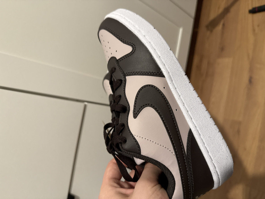 A close-up shot features a Nike Court Vision Low sneaker. The shoe has a white speckled sole, tan panels, and dark brown overlays. The iconic Nike swoosh is brown, matching the laces and trim. The sneaker is held in a hand against the backdrop of a cream-colored door and wood flooring.