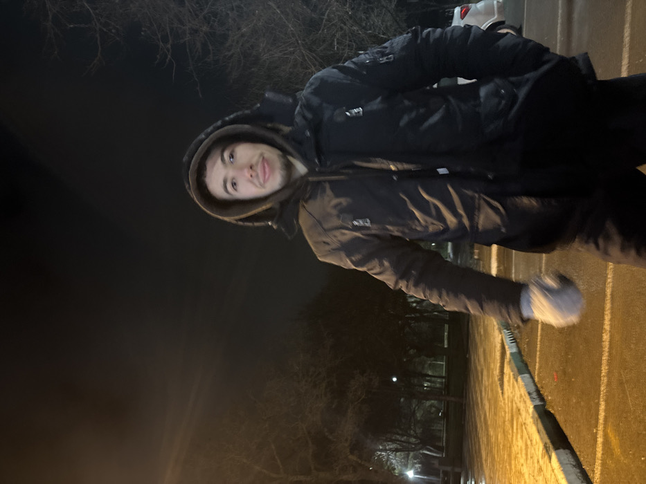 A person in a hooded jacket stands on a street at night. The individual faces the camera with a slight smile. Trees and street lights are visible in the background. The street has a light-colored surface. The jacket is dark, and the hood is up, framing the person's face. Part of a vehicle is visible in the upper background.