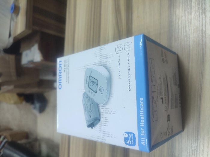 - "An Omron M2 Basic Automatic Upper Arm Blood Pressure Monitor, still in its white retail packaging with a blue bottom stripe and "5 YEAR GUARANTEE" seal, rests on a light brown wood-grain patterned surface" by FM-QTCIw1, licensed under CC BY 4.0
