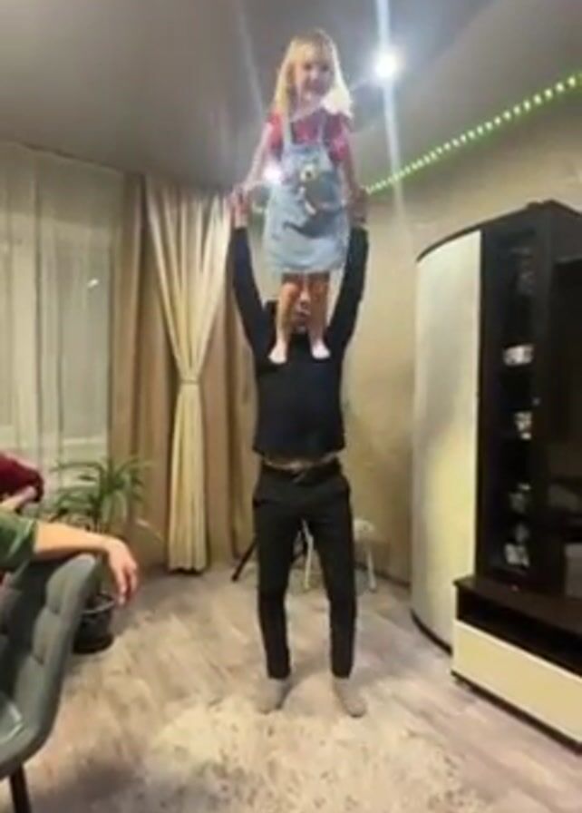 A man with dark hair is standing in a living room, holding a young girl with blonde hair on his shoulders