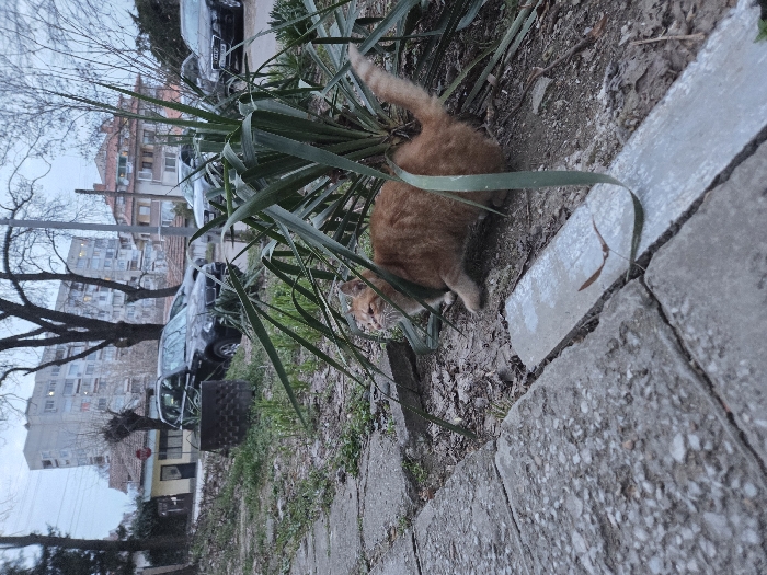 The scene depicts an urban street verge in Pleven, Bulgaria, under an overcast sky. In the foreground, an orange tabby cat, featuring white paws and muzzle, is observed in a low, crouched position. The cat is partially obscured by the sword-like, green leaves of a large yucca-type plant, positioned within a patch of dry, disturbed earth. Its head faces left, and its orange and white striped tail is visible, raised behind the plant foliage. A cracked concrete pedestrian path, composed of multiple uneven slabs, borders the dirt patch to the left. In the midground, beyond the verge, a paved street is visible. Several vehicles are parked along the street, including a dark-colored BMW X5 SUV and a black Audi sedan, among others. A single-story building with a yellow facade and a red tiled roof is discernible to the left, with a red octagonal stop sign mounted on a pole nearby. Bare-branched deciduous trees and a utility pole with wires are also present. The background features a large, light-colored, multi-story residential apartment building with numerous windows, alongside other smaller residential structures characterized by tiled roofs. The ambient light suggests an overcast day or twilight conditions.