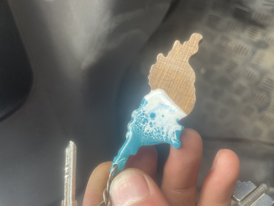 The image does not depict a location in the city of Juta, Georgia. The scene is a close-up, depicting a human hand holding a keyring assembly. The hand's skin appears light-toned, with visible fingerprints and clean fingernails on the thumb, index, and middle fingers. The keyring includes at least two metallic, silver-colored keys, with one partially visible at the upper left and another at the lower left. The primary object is a decorative keychain attached to the keys via a metal split ring. This keychain is shaped like a stylized landmass or island, approximately two-thirds of which is covered in a turquoise-blue and white epoxy resin, exhibiting a detailed cellular or "sea foam" pattern. The remaining one-third of the keychain is made of light-brown wood, displaying distinct vertical grain lines. The background is dark and out of focus, indicating an interior setting, likely a vehicle. Visible elements of the background include a dark gray, smooth plastic surface in the upper portion and a dark, textured surface resembling a rubber or metallic diamond plate floor mat in the lower portion.