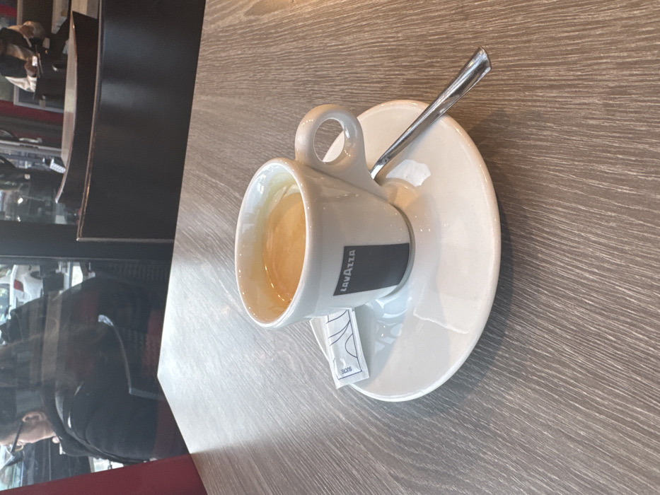 The image presents a detailed view of a cafe table, with a clear focus on the items placed upon it. A white ceramic cup, branded "LAVAZZA" in black, contains an amber-colored liquid, suggestive of coffee or espresso. This cup rests on a matching white ceramic saucer, which also holds a silver-colored spoon and a small white paper packet labeled "SUCRE." The table surface is light-colored wood, exhibiting a distinct horizontal grain pattern. Beyond the table, a large window overlooks an urban street, visible through reflections and blurred outdoor elements including a white car. Inside the cafe, to the left, a person with dark hair and glasses, wearing a dark jacket, is seated with their back to the viewer. Further into the background on the right, another individual is partially visible. Dark-colored chairs with curved backs are present within the cafe's interior. This scene is consistent with a cafe environment in a city such as Caen, France, though specific identifiers for a precise location within Caen are not discernible from the image itself.