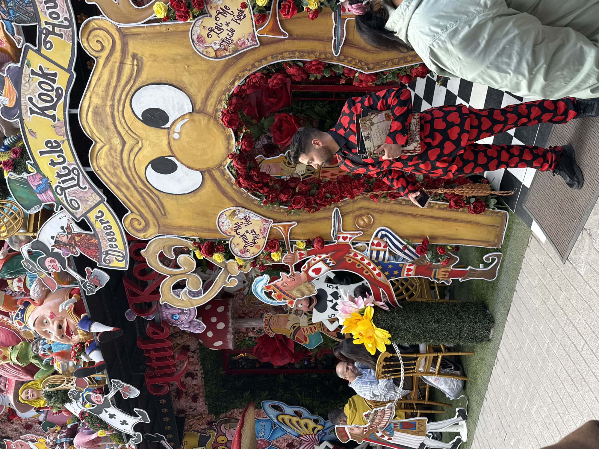 person in a red suit with black hearts posing inside a whimsical display for photos. The display is decorated with red roses, illustrations and the text "Little Kook House." The person in the red suit is holding books. Other people are in the background, including a person in a light green jacket standing next to the display and people sitting at tables. The scene is on a paved sidewalk or patio. Based on the "Little Kook House" signage, the location is likely in Athens, Greece, where a café chain with that name is known to exist.