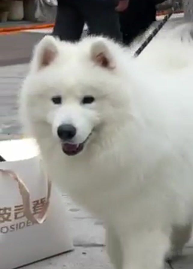 A white Samoyed dog is standing on a paved area. It is leashed and held by a woman wearing a beige coat and a grey skirt. Another woman in a lilac coat is also present. Both women appear to be talking animatedly. The scene takes place in an urban environment. Other people are walking by in the background. A shopping bag is visible next to the dog.