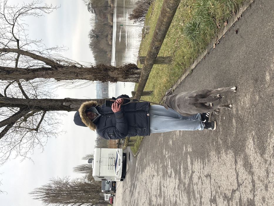 The image depicts an outdoor scene in Bech-Kleinmacher, Luxembourg, along what appears to be a riverside or lakeside path. A Caucasian male, estimated to be middle-aged with a grey beard, stands centrally on a paved walkway. He is dressed in a dark blue or black hooded winter jacket with a fur-lined hood, light blue sweatpants, and black sneakers. The man is holding a black smartphone horizontally with both hands, looking at its screen. A leash extends from his hand to a grey, muscular dog, possibly a Pitbull-type, positioned to his right and slightly behind him. The dog, facing away from the camera, stands on the path with its head slightly turned towards the man. To the immediate right of the paved path, a low wooden rail fence separates the walkway from a grassy bank that slopes down to a wide, calm body of water. The far bank of the water is lined with leafless deciduous trees. To the left of the path, a row of tall, bare trees stands. Beyond these trees, on an unpaved surface, a line of recreational vehicles is parked. The closest vehicle is a large white camper van with a satellite dish mounted on its roof and a bicycle rack at the rear. Additional vehicles, including a darker-colored camper and a red car, are visible further down the line. The sky is overcast, indicating a cold or temperate season.