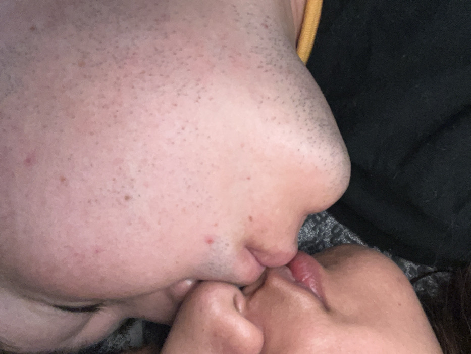 This close-up image depicts two individuals engaged in a kiss