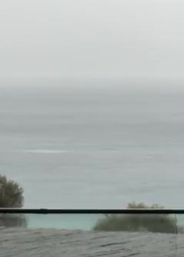 view of the ocean on a gray, rainy day. The camera appears to be looking out from a patio or balcony, with a glass railing visible in the foreground. There are a few small bushes or trees visible between the railing and the ocean. The ocean is a light gray color, and the sky is overcast with a thick fog or heavy rain. The focus is on the distant horizon, which is blurred by the weather conditions. In the upper part of the frame, the edge of a building, possibly a roof or eave, can be seen, hinting at the perspective from within a structure.