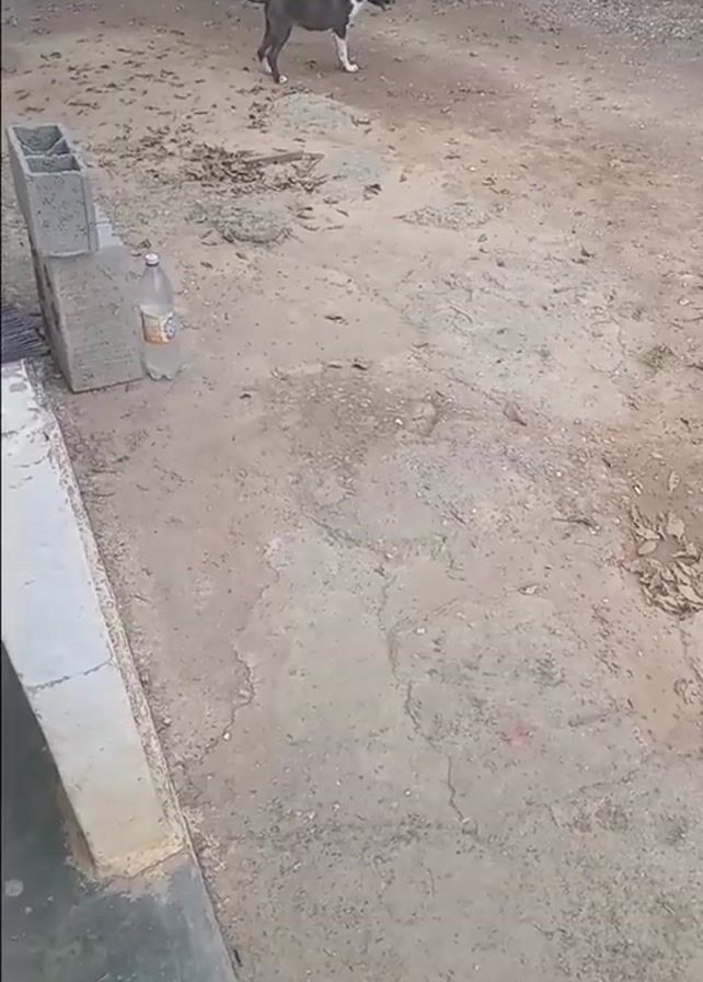 small black and white dog being called towards the camera. The dog is standing in a large, dirt-covered yard with scattered debris and foliage. The yard is surrounded by trees and buildings, with a tractor visible in the background. The dog runs towards the person holding the camera. The person is standing on a concrete porch or patio and is wearing a gray clog on their foot. The camera is held steady, providing a clear view of the dog's approach. The audio captures the person calling the dog's name, "Marrón," and making whistling sounds to encourage it to come closer.