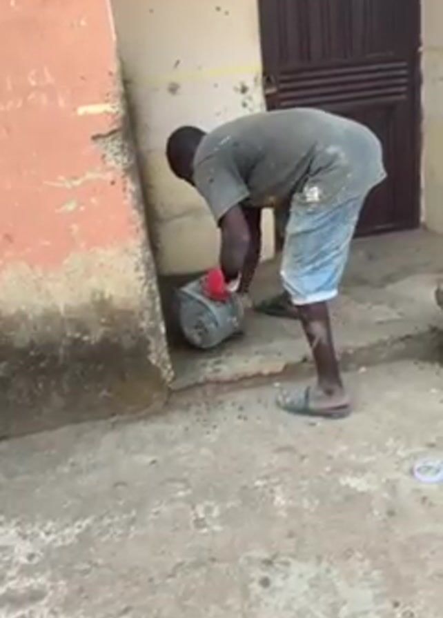 A man wearing a gray t-shirt and light-blue shorts is crouched down, vigorously scrubbing a gray bucket on the ground. The man has on a pair of gray sandals. The man has red gloves on his hands. He is standing outside a building with a textured concrete ground. Next to the man is a peach-colored wall with signs of damage and wear. To his right, a dark brown door with vertical panels and a small grill is visible. There is masking tape on the ground by the door. The area is generally bright and outdoors.