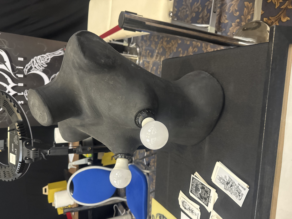 A black, headless female mannequin torso, made of a matte, textured material, stands prominently on a dark, rectangular display surface. Two spherical, frosted white LED light bulbs are screwed into the mannequin's chest, positioned where nipples would be. On the same surface, in the foreground, are multiple stacks of small, rectangular white cards with black stylized illustrations, resembling tattoo designs. Some cards visibly display the text "bildes.co.uk". The background reveals an indoor exhibition or convention environment. To the left, a blue-backed chair, yellow containers, and a circular LED ring light (model JB300B) on a stand are partially visible. Directly behind the mannequin is a black banner or backdrop featuring white stylized graphics, including a skeletal hand and partial text reading "studio". To the right, a light-colored padded bench or table is visible, partially cordoned off by a dark stanchion with a red retractable belt. The floor is covered with a dark blue carpet adorned with gold and light brown ornamental patterns. This scene is situated within an exhibition hall or conference center in Skopje, North Macedonia, likely during a trade show or convention, possibly a tattoo convention, based on the specific displays and setup.