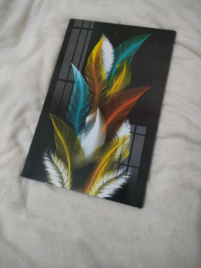 A rectangular, glossy print, approximately 1:1.7 aspect ratio, depicting an abstract arrangement of multi-colored feathers on a dark background, lies diagonally on a light-colored, wrinkled fabric surface. The feathers are prominent, rendered in hues of yellow, gold, teal, white, and reddish-brown, clustered and overlapping. The print's dark background features subtle vertical and horizontal darker grey lines, suggesting a grid or window-like pattern. The surrounding fabric appears to be a light beige or cream textile, possibly a blanket or sheet, exhibiting soft folds and a textured surface. The scene is located in Juja ward, Kenya.