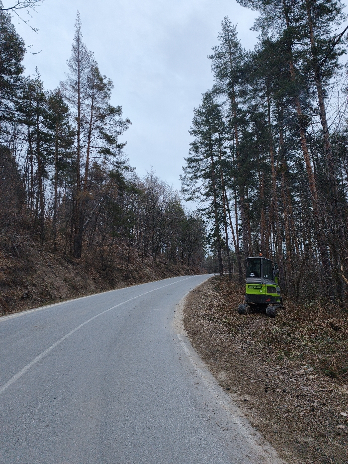 The scene depicts an unpopulated, forested roadway located in Sveti Konstantin, Bulgaria, under a uniformly overcast sky. A grey asphalt road, marked with a single solid white center line, curves gently to the right and extends into the distance. The road surface appears dry. Dense forest flanks both sides of the roadway. On the left, the terrain slopes upward, covered primarily by bare deciduous trees and some conifers, with dry leaves and sparse undergrowth on the forest floor. On the right, an unpaved, earthen shoulder separates the road from a dense stand of tall pine trees and some bare deciduous trees. A compact, lime-green utility vehicle, identified as a mini-excavator or compact loader, is parked off the right shoulder, partially obscured by the trees. The vehicle features a dark-tinted cab, visible tracks or small wheels, and partial text on its side reading "200 WL 420F" and "TOOL". No individuals or active operations are present in the image.