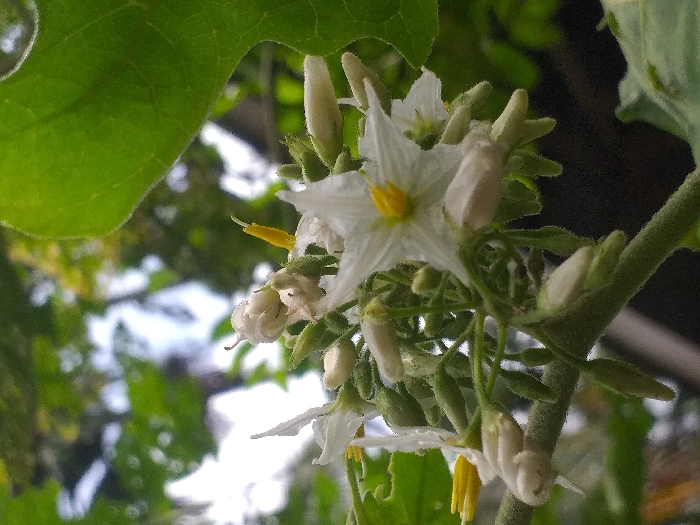 White star-shaped flowers with yellow centers bloom amidst numerous closed, pale green buds on a green, fuzzy stem. A large, vibrant green leaf arches across the upper left corner, partially obscuring the background which features more foliage and a glimpse of the sky. The plant appears to be growing outdoors, bathed in natural light.